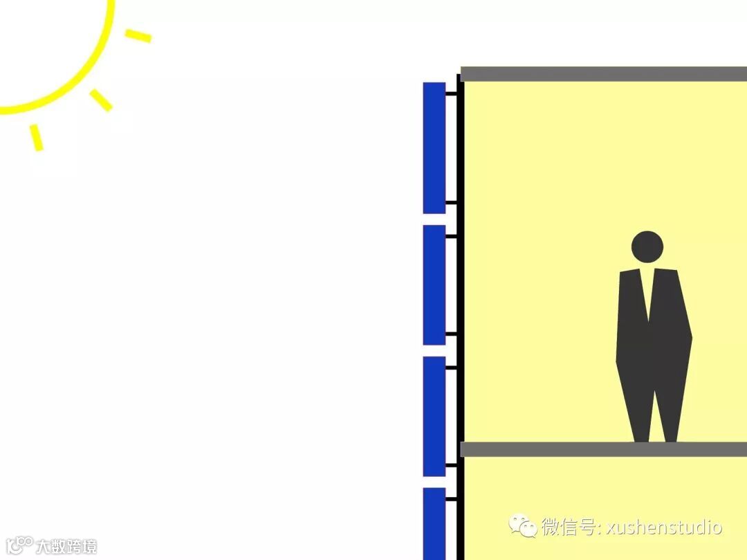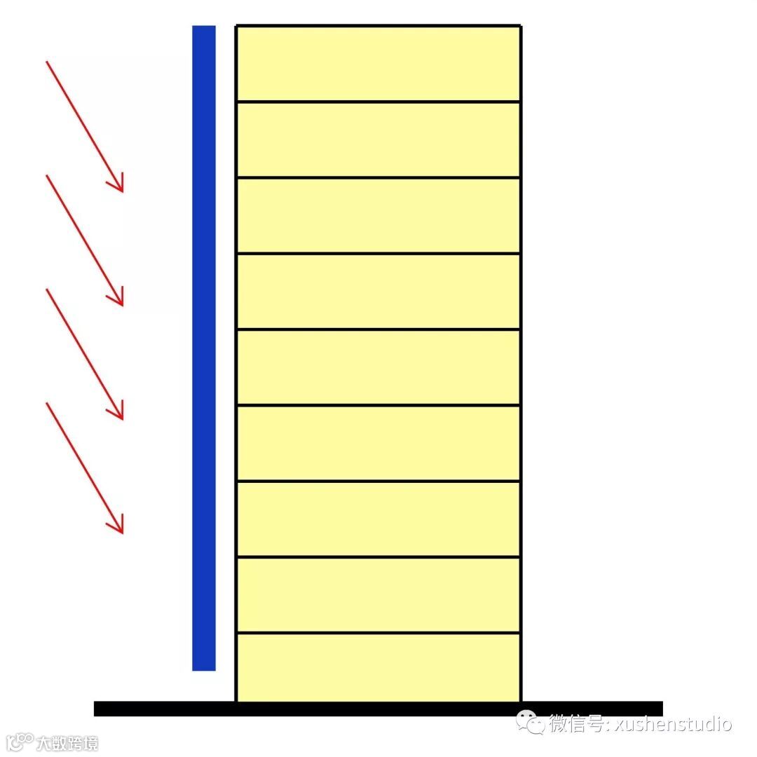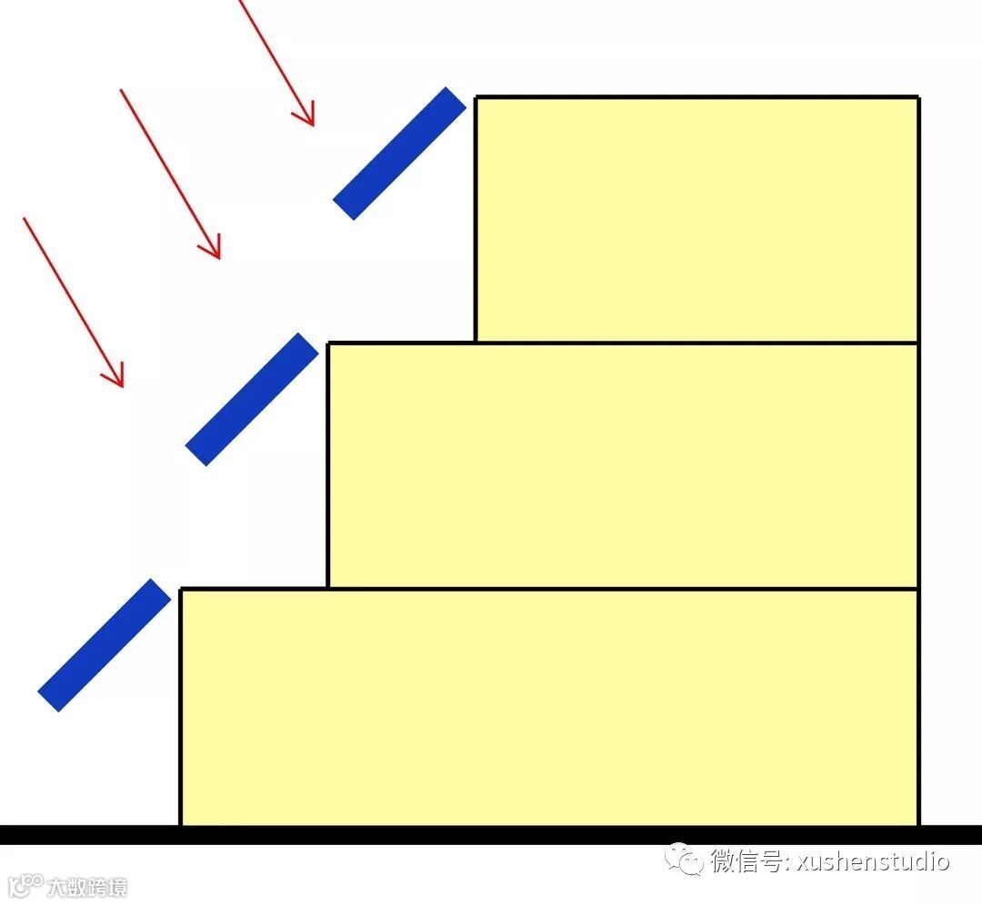 为使光伏构件获得更多的太阳辐射,可采用竖直向锯齿状墙面的设计方式。人视线以上的墙面倾斜向上,外侧布置光伏构件;人视线以下的墙面倾斜向下,布置窗和墙体。从剖面上看,建筑每层锯齿状凸出,景观视线和遮阳问题一并解决。但该方式会造成建造施工和清洁维护的不便(图2-17)。