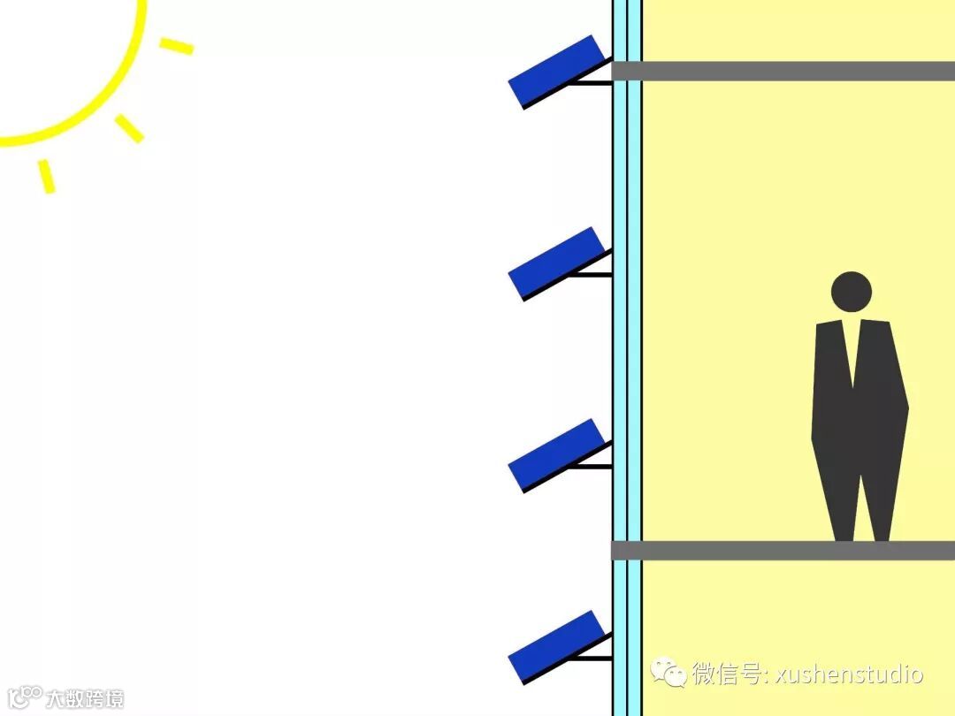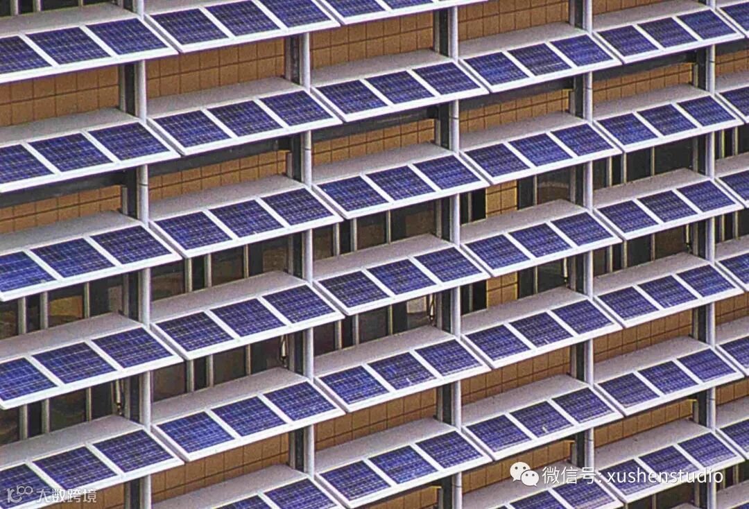 光伏构件可布置在遮阳板上,成为建筑的附属构件,光伏遮阳板与建筑表皮独立,不影响外墙的保温、防水和防噪。对于新建或改建的情况都比较适用,建造成本也较低(图2-19)。