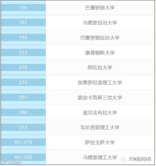 根据2017年最新QS世界大学排名,西班牙三所高校进入世界前200名,分别是巴塞罗那大学(156名),马德里自治大学(187名)和巴塞罗那自治大学(195名),其中,西班牙有11所大学进入世界前500。