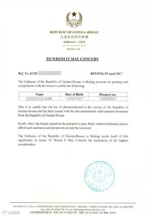 几内亚比绍驻北京大使馆所核发的护照真伪证明文件