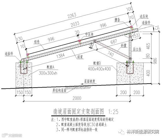 支架设计时,可利用预制砼墩将组件下边缘抬高到预定设计高度。配重块及配重块上的U型地脚螺栓均采用现浇形式并保证配重顶面标高处于同一水平。支架采用U型截面钢,支架斜梁长应每边略超出组件边缘以考虑安装的便捷性。