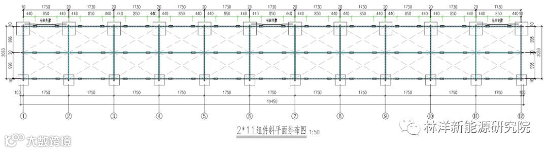 光伏专业拟定好组件排布后,结构设计人员应对排布好的组件进行总体尺寸与局部尺寸的确认。结合砼屋面的散水坡度或者局部带有透气管等形式的砼屋面因地制宜的确定组件下边缘的最低高度。另外,对于双面组件支架加檩条的形式,支架的间距需要遵循一定的规律布置以避免支架本身对组件背部产生阴影遮挡。以林洋N型双面组件(组件尺寸:1730X996X6mm)为例,当横排2X11排布(组件之间净间距20mm)时,可以考虑在组件相邻位置处设置支架或隔一设一最后优选出用钢量较少的方案。