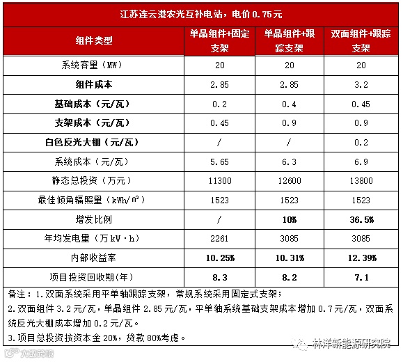 结论:在农光互补电站项目中,单晶组件+平单轴方案比常规组件+固定支架方案成本多出0.65元/MW,发电量增加10%,投资收益率和回收期基本持平,优势不明显。双面组件+平单轴方案虽比常规组件+固定支架方案成本多出1.25元/MW,但因其增发优势明显(36.5%),能大幅提高电站内部投资收益率,并大大缩短投资回收期,更具经济性。