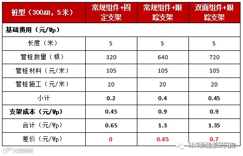 由表1可得出,双面组件+平单轴跟踪支架系统方案比常规组件+固定支架方案的支架和基础成本增加了0.7元/Wp,常规组件+平单轴跟踪支架系统方案比常规组件+固定支架方案的支架和基础成本增加了0.65元/Wp。