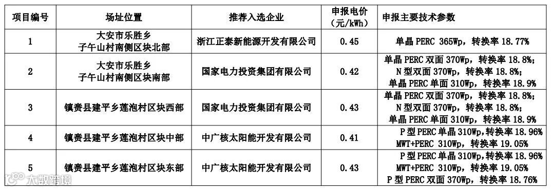 白城公布领跑者中标名单根据白城光伏发电应用领跑基地优选工作方案,白城市人民政府组织白城光伏发电应用领跑基地竞争优选,现将基地内各项目排名第一的推荐投资企业及必要信息公示如下: