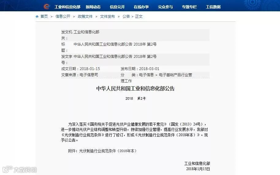 光伏制造行业规范条件七大变化2018年3月1日,工信部印发了《光伏制造行业规范条件(2018年本)》,自3月1日起实施,而此前执行的《光伏制造行业规范条件(2015年本)》同时废止。相比于老版本,新版本究竟有哪些变化呢?
