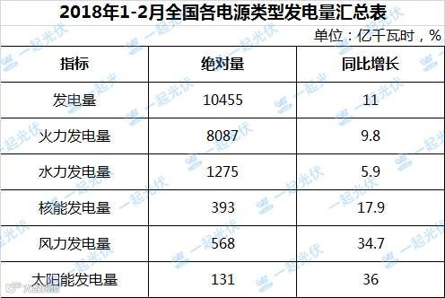 1~2月太阳能发电量同比增长36%国家统计局发布数据显示,1-2月,全国发电量10455亿千瓦时,同比增长11%,其中太阳能发电量131亿千瓦时,同比增长36%,增速位居各电源类型之首(详见下表)。