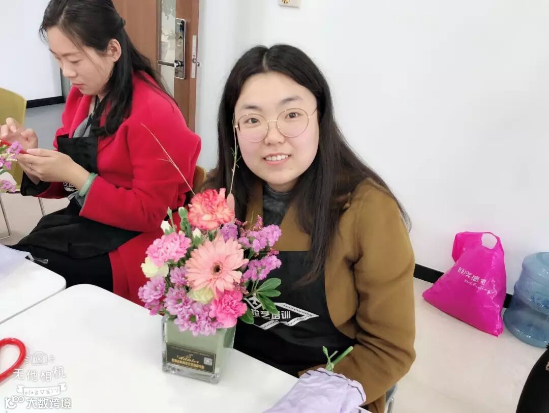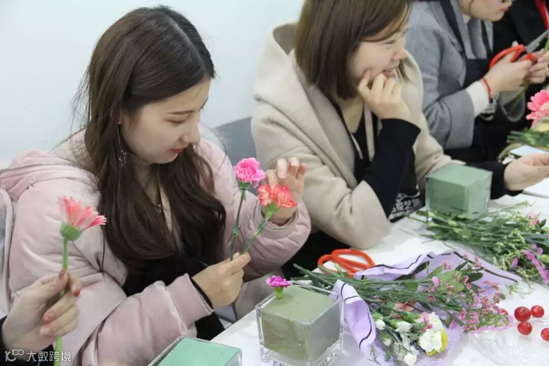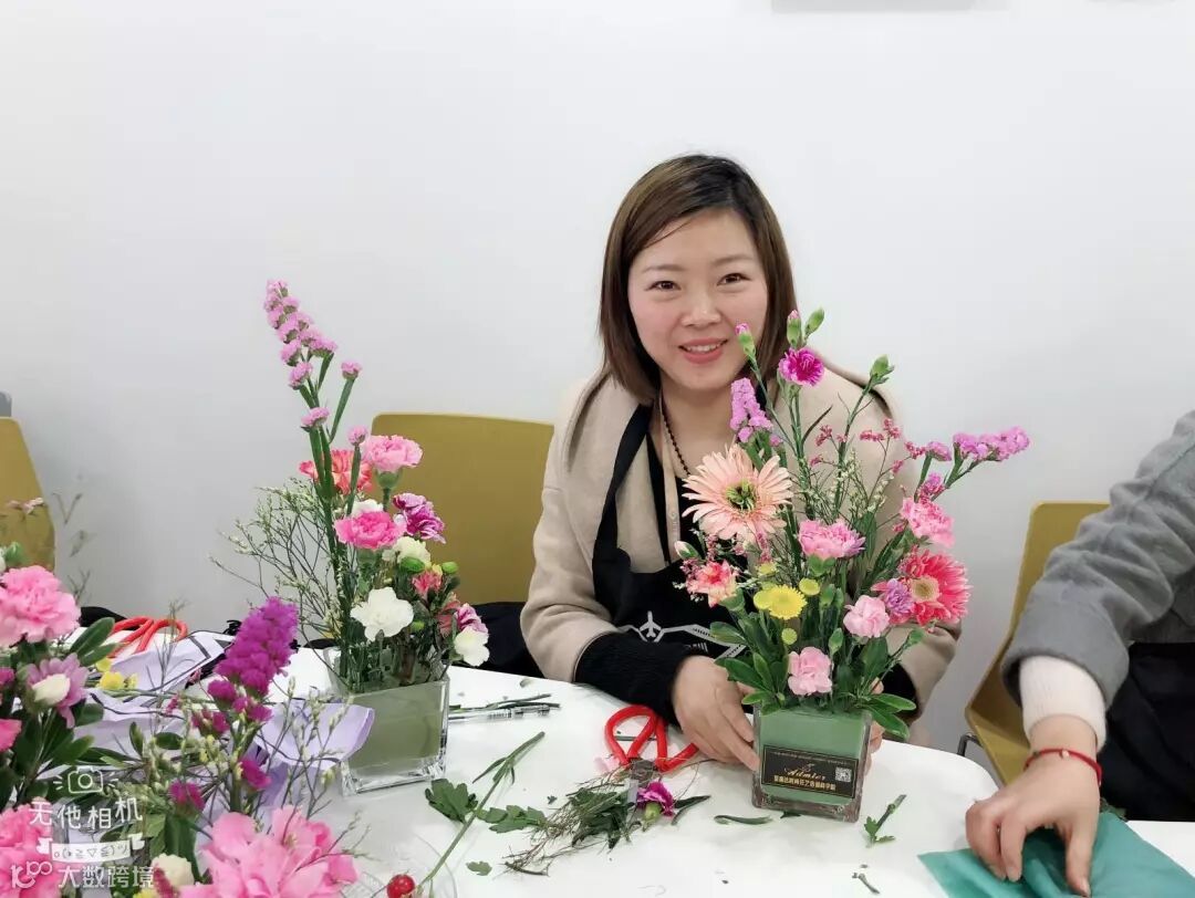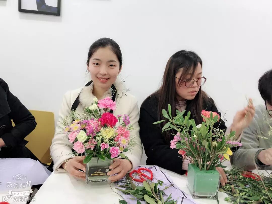 课程伊始,老师为大家讲解了插花的基本技巧以及基本花材的花语,此次的插花,颜色均以鹅黄嫩绿、粉嫩淡雅、色调明快的花卉为主,在老师的演示下,很快一幅娇艳欲滴的插花作品就呈现在大家的面前。