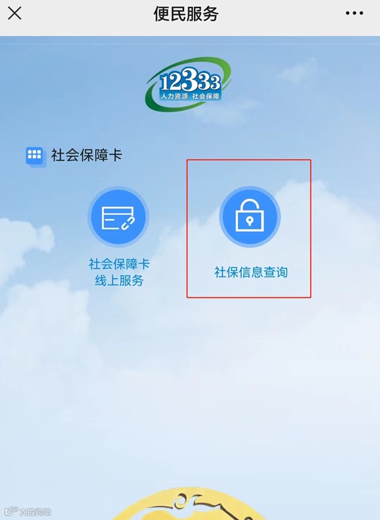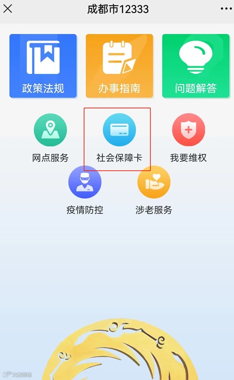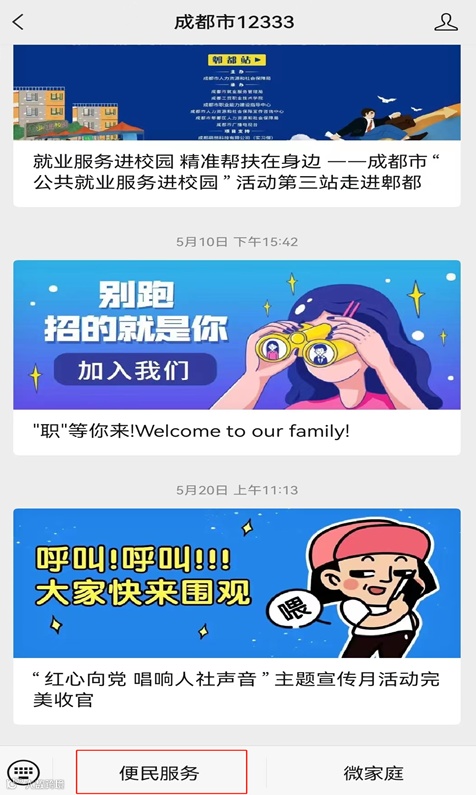 1、微信搜索并关注"成都市12333"微信公众号,选择进入"便民服务"。