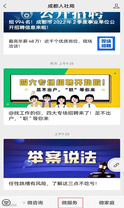 1、微信搜索并关注"成都人社局"微信公众号,选择进入"微服务"。