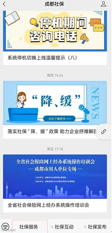 1、微信搜索并关注"成都社保"微信公众号,选择进入"社保服务"。