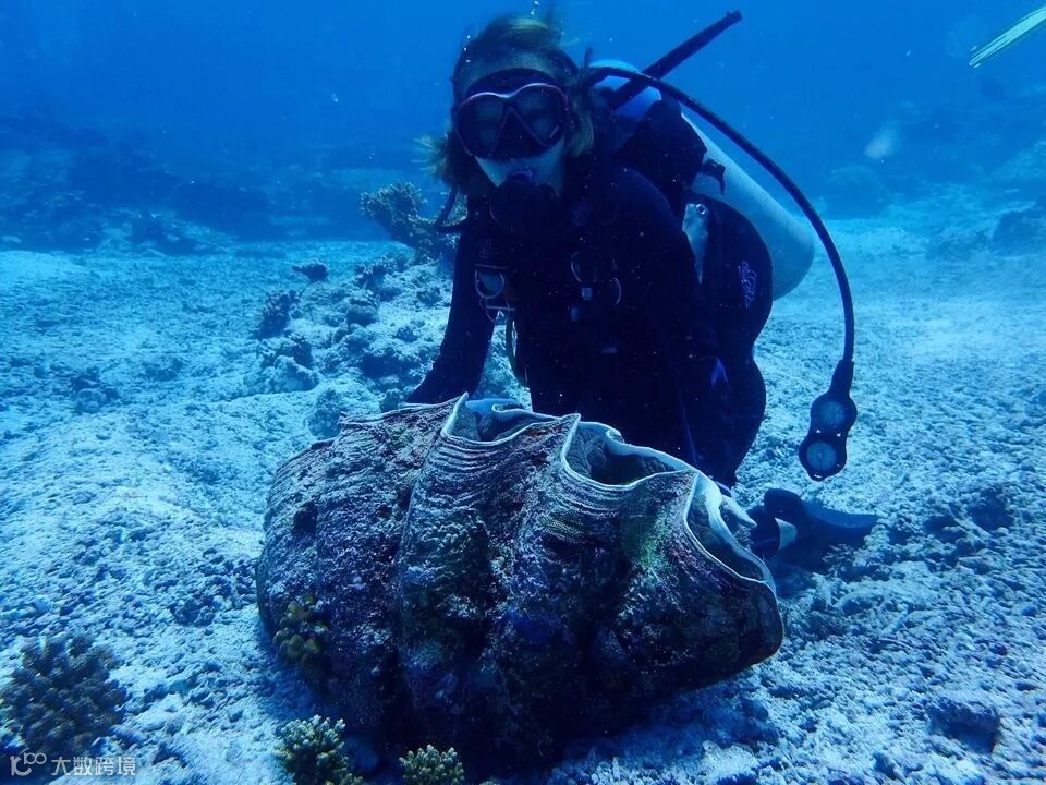 活了几百年的干贝什么样子?在干贝城一睹为快。上百颗五颜六色,直径超过1公尺的巨贝安静的生长在水中。像小桌子那么大的车磲贝散落在海底,快活的自由生长。