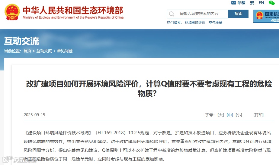 《建设项目环境风险评价技术导则》(HJ 169-2018)10.2.5规定,对于改建、扩建和技术改造项目,应分析依托企业现有环境风险防范措施的有效性,提出完善意见和建议。对于改扩建项目环境风险评价,首先重点针对改扩建部分内容,其他部分可进行环境风险回顾性分析,提出完善意见和建议。Q值原则上可以本次扩建工程中新增的危险物质量计算,但当扩建项目新增危险物质与现有工程危险物质位于同一危险单元时,应同时考虑与现有工程的累加影响。来源:生态环境部部部长信箱回复汇编(更新到2025-09-29)