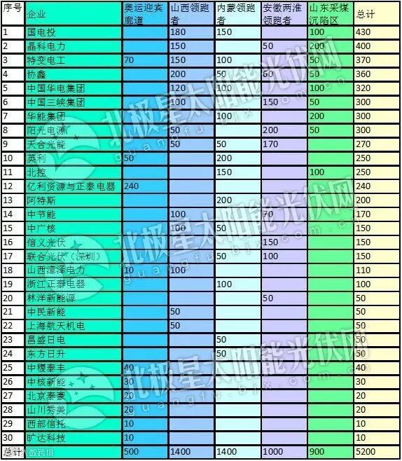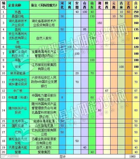 下表为获得集中式地面电站扶贫指标的Top 20企业统计