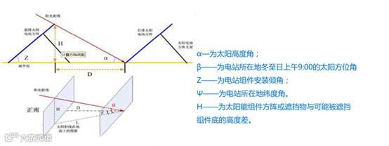 一般光伏组件阵列阴影遮挡确定原则为:在一年中白天最短的一天(冬至日)上午九点至下午三点确保组件上无任何阴影遮挡,太阳能方阵间距应不小于D。