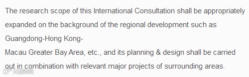 本次国际咨询应在粤港澳大湾区等区域发展背景下适度拓展研究范围,结合周边重大相关项目开展规划设计。