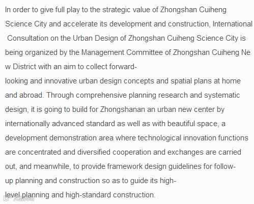 本次国际咨询,旨在面向全球公开征集具有前瞻性与创新性的城市设计理念和空间方案,为中山塑造一个具有国际先进标准与优美空间形象的城市新中心、一个科技创新功能集聚和多元合作交流的高质量发展示范区。