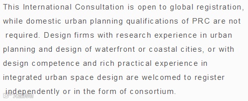 本次国际咨询活动面向全球进行,不要求具备国内规划资质,欢迎具有滨水或滨海城市规划设计研究经历、富有城市综合空间设计能力与实践经验的设计机构独立或组成联合体报名参加。