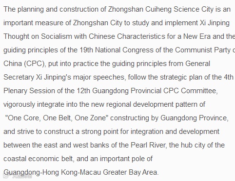 规划建设中山翠亨科学城是中山市深入学习贯彻习近平新时代中国特色社会主义思想和党的十九大精神,认真贯彻落实习近平总书记重要讲话精神,按照省委十二届四次全会的战略部署,积极融入全省构建“一核一带一区”区域发展新格局,奋力建设珠江东西两岸融合发展支撑点、沿海经济带枢纽城市和粤港澳大湾区重要一极的一项重要举措。