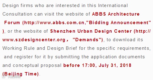 有意向参与本次国际咨询的设计机构请浏览ABBS建筑论坛(http://www.abbs.com.cn,招标公告板块)或深圳市城市设计促进中心网站(http://www.szdesigncenter.org,需求板块)下载本次国际咨询的工作规则和技术任务书了解具体要求,并于北京时间2018年7月31日17:00前提交报名文件和概念提案进行报名。