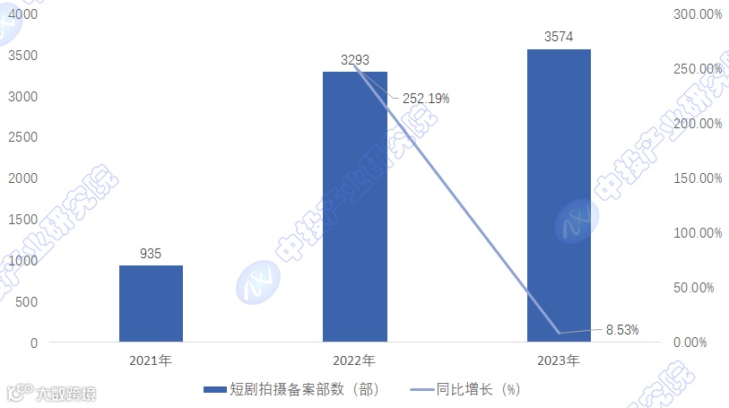 2022年中国微短剧市场规模达101.7亿元,同比上升176.4亿元;2023年中国微短剧市场规模达373.9亿元,同比上升267.65%。2023年短剧备案部同比增长8.53%达3574部,平均每部集数由2022年的23集增长到2023年的27集;2023年上新短剧TOP3题材为爱情、都市、奇幻,占比分别为37.3%、25.5%、12.6%。
