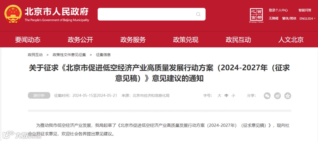 2024年5月15日,北京市经济和信息化局发布了关于征求《北京市促进低空经济产业高质量发展行动方案(2024-2027年)(征求意见稿)》意见建议的通知。