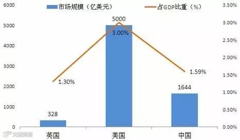 图表 2015年英国、美国和中国共享经济市场规模及其占GDP比重