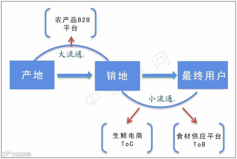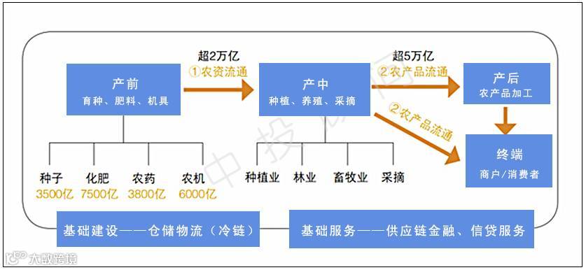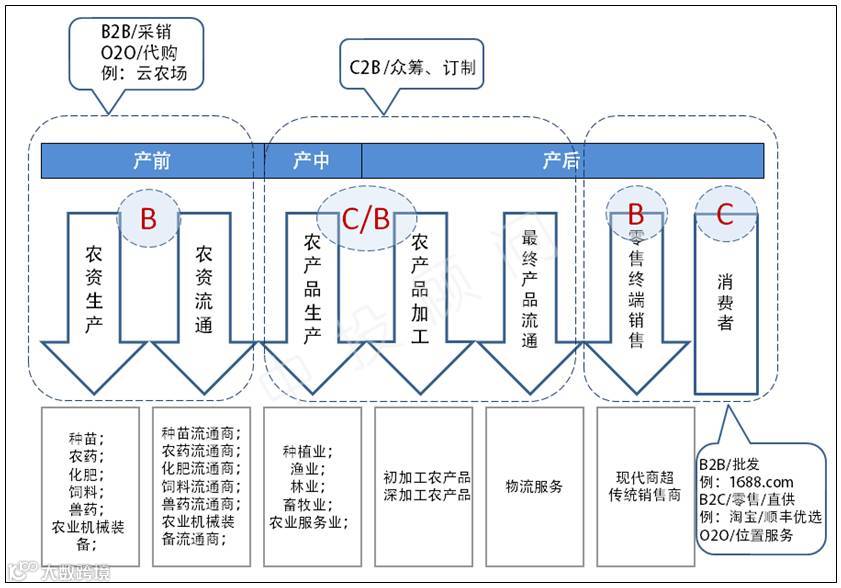 传统农业产业链,从交易层面看,上游集中在农资交易环节,中游集中在农产品加工环节,下游集中在农产品贸易环节,物流、金融则贯穿整条产业链。产业链下游这个环节终端消费者是主要服务对象,电商以阿里、京东综合电商平台、顺风优选、本来生活等垂直生鲜电商为主导,社区O2O进行试水。