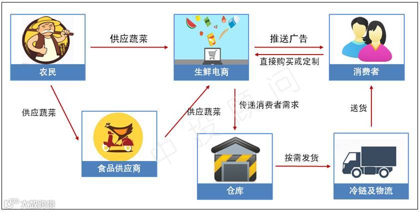 在生鲜电商产业链中,农民和大宗食品供应商共同构成产业链供应上游;生鲜电商起到中转站的传递作用,负责接收或挖掘消费者需求;仓库和冷链共同组成物流配送部分;消费者则可以直接购买或者按照自己需求进行食品定制,构成了整个链条中的需求方。