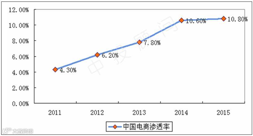 四、根据中国电商渗透率发展历程来看,我们大胆预测在未来三年内农村电商渗透比率将会由7%上升至10%,若农村整体市场增速与GDP相近,维持在6%左右,则2018年农村电商市场有望达到1.2万亿,年均复合增长率为15%左右。