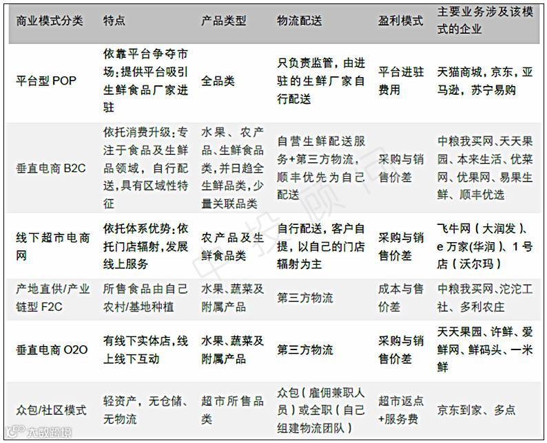 国内生鲜电商的商业模式可以分为平台型POP、垂直电商B2C、线下超市电商网、产地直供F2C、垂直电商O2O和社区模式。其中,市占率额较大的平台型生鲜电商京东和亚马逊主要采取的是自建冷链的形式,而苏宁易购由于切入生鲜电商较晚,现在采取的是和第三方物流合作的形式,但是未来也会加大对自建冷链的投入。