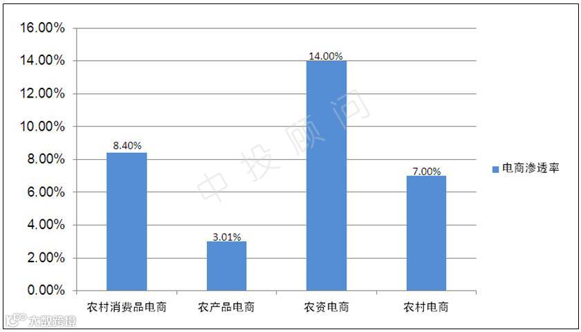 三、农村电商当前市场渗透率比较低,其中农资市场电商渗透率最高,达到14%,农村消费品电商次之,农产品电商渗透率最低,仅为3.01%,整个农村电商的渗透率也只有7%,低于社会10.8%的平均水平。