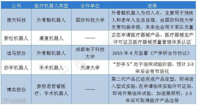 二、目前涉足医疗机器人研发的既有类似于哈工大和国防科大的高校科研院所,也有楚天科技集团、思哲睿智能医疗设备、妙手机器人科技集团、沈阳六维康复机器人等集团公司,而近几年,高校和企业合作,科研资源相济、资本协助、产业化链条式发展逐渐成为未来行业内的战略导向。