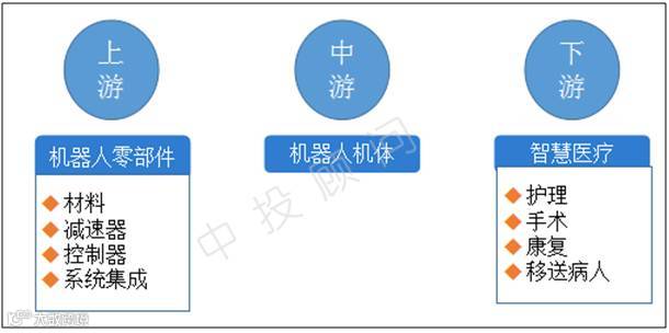 从产业链来看,医疗机器人产业链的上游为机器人零部件,中游为机器人本体,下游为智慧医疗产业的诸多应用市场。其中,上游伺服电机、控制器和减速器三大核心零部件国产的大规模使用尚需时日;中游从事机器人本体生产的国内企业截至2014年底已超过100家,竞争激烈,产品同质化严重,低端产能过剩。