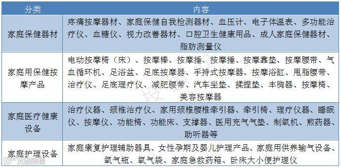 家用医疗器械是指主要适用于家庭使用的医疗器械,它区别于医院使用的医疗器械,操作简单、体积小巧、携带方便是其主要特征。我国家用医疗器械主要分为四类:家庭保健器材、家庭用保健按摩品、家庭医疗康复设备和家庭护理设备。