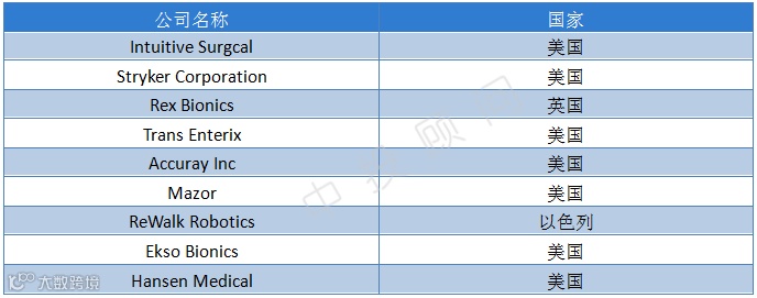 三、目前全球医疗机器人行业中欧美地区的医疗企业占据了较大的市场份额,处于市场主导地位,全球最大的10家医疗机器人企业中大部分是美国和欧洲公司。其中,美国医疗机器人行业在全球处于领先地位,已发展到30多个。
