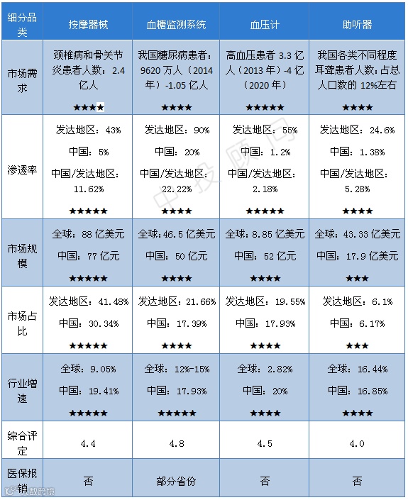 二、从细分市场来看,按摩器械、血糖监测系统、血压计以及助听器为前4大品类,综合市场需求、渗透率、规模及占比和行业增速等要素粗略的量化评级,血糖监测系统的行业属性相对较好。
