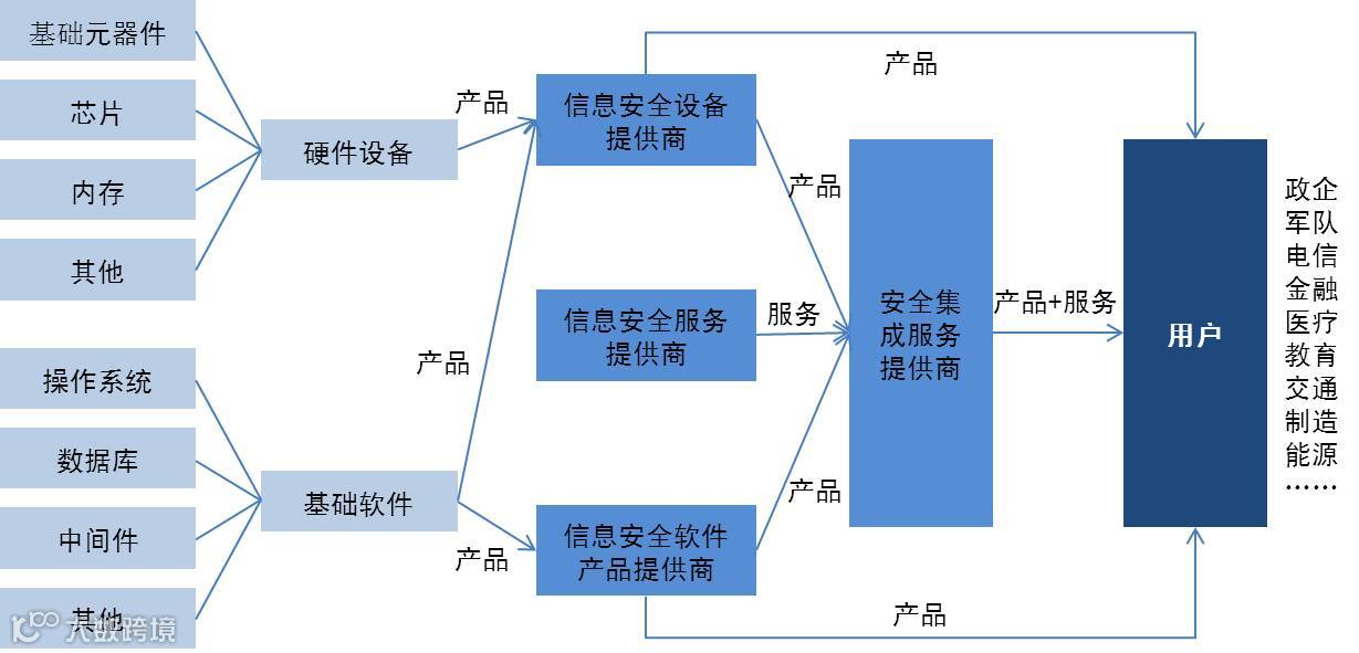 产品提供商又可以分为硬件、软件产品以及服务提供商,其一方面直接将产品/服务通过直销或分销模式销售给最终客户,另一方面也将产品销售给信息安全系统集成商。