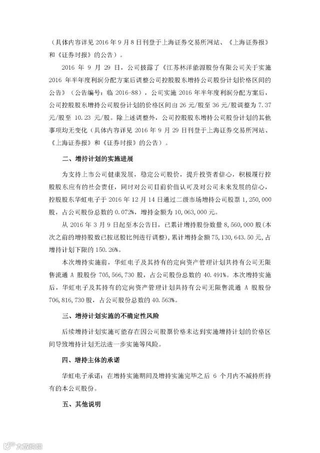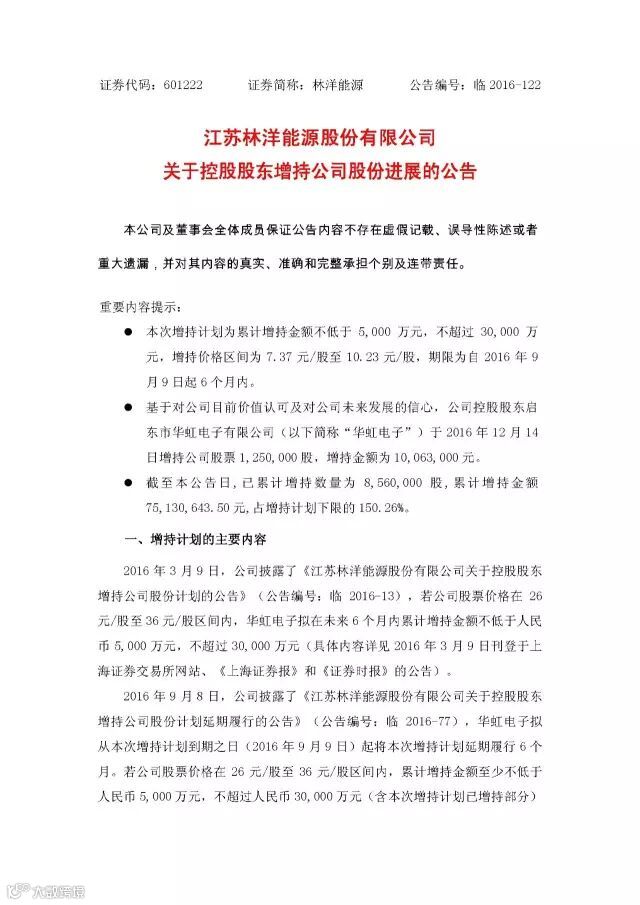 导读:2016年12月15日【江苏林洋能源股份有限公司 关于控股股东增持公司股份进展的公告】