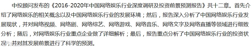 报告名称:《2016-2020年中国网络娱乐行业深度调研及投资前景预测报告》