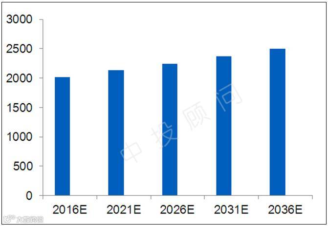 图表 发动机2016—2036年市场规模预测(单位:亿元)