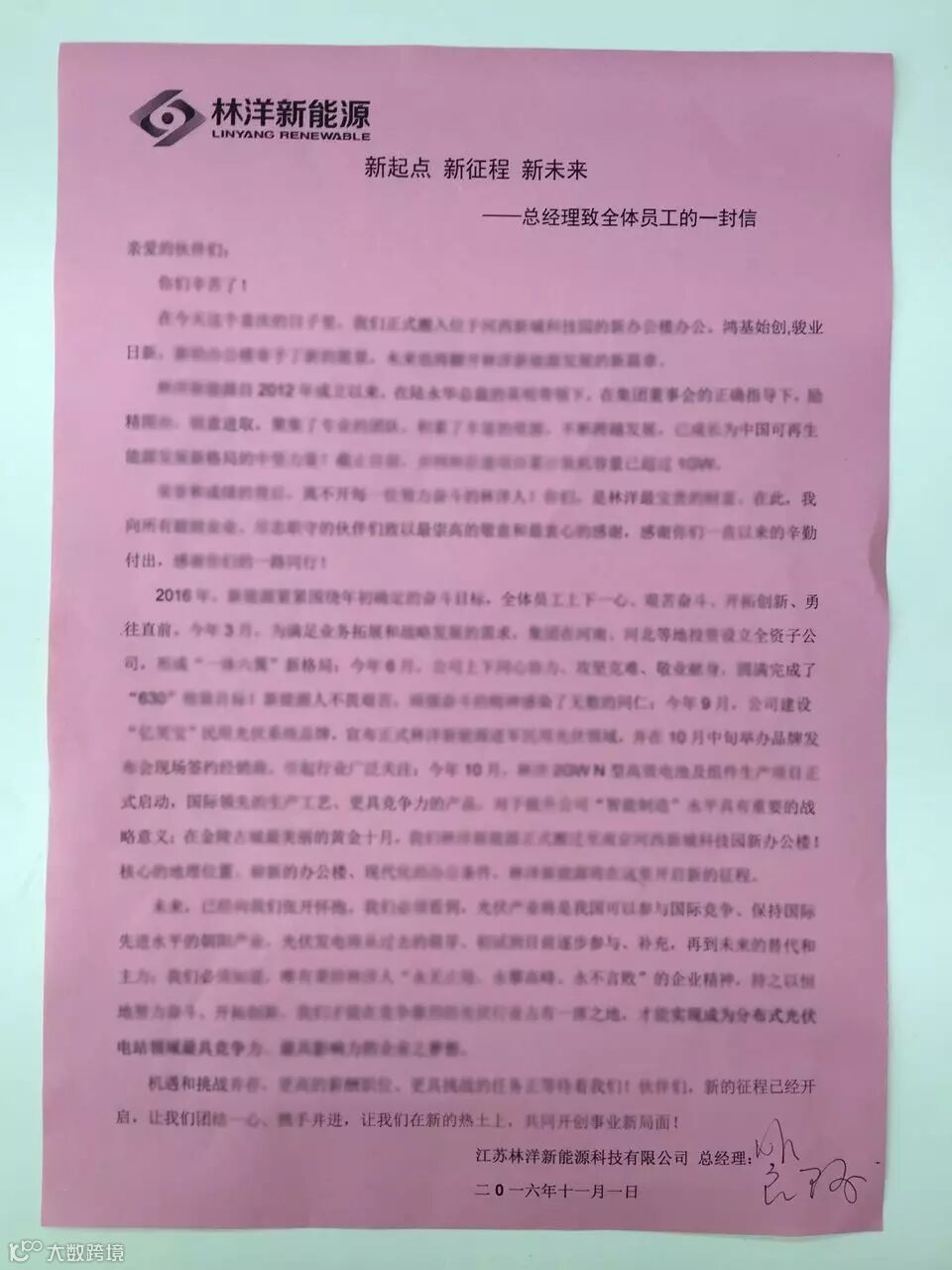 林洋新能源总经理裴骏先生致全体员工的一封信