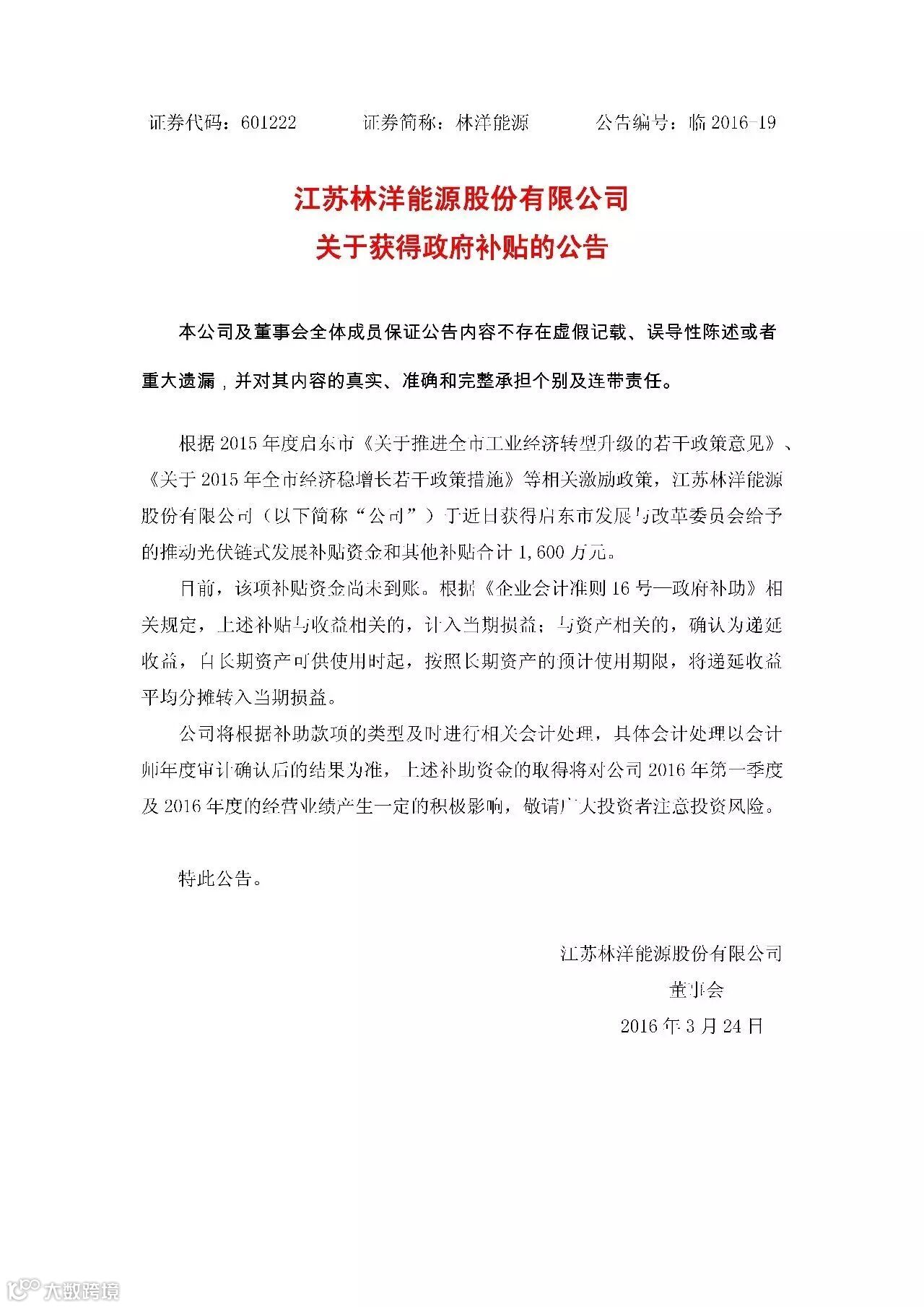 政府发放光伏补贴,实际上是从节能减排的角度做出的决策。从新能源、可再生资源的发展角度考虑,给予光伏产业适度的补贴不仅表明了政府支持可再生能源发展的坚定决心,在一定程度上也能够提升企业的经济效益、增强社会责任感。分布式光伏电站、微电网等业务目前是林洋能源重点发展的产业领域,此次获得补助资金,不仅表明了当地政府部门对于林洋能源在此领域前期工作的认可,也将助力林洋能源快速发展分布式能源及微电网等相关业务,提升整体竞争优势,形成新的业绩增长点。