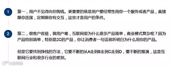 很多人一上来就老想说我在互联网里怎么赚钱,我不是不爱钱,但是如果你在互联网上刚开始想怎么赚钱,就想着弄客户,你可能就没有用户,没有用户我觉得其它互联网的东西都免谈。