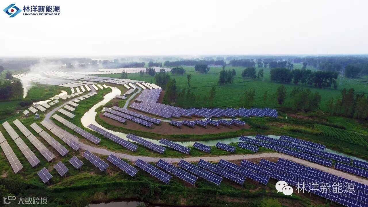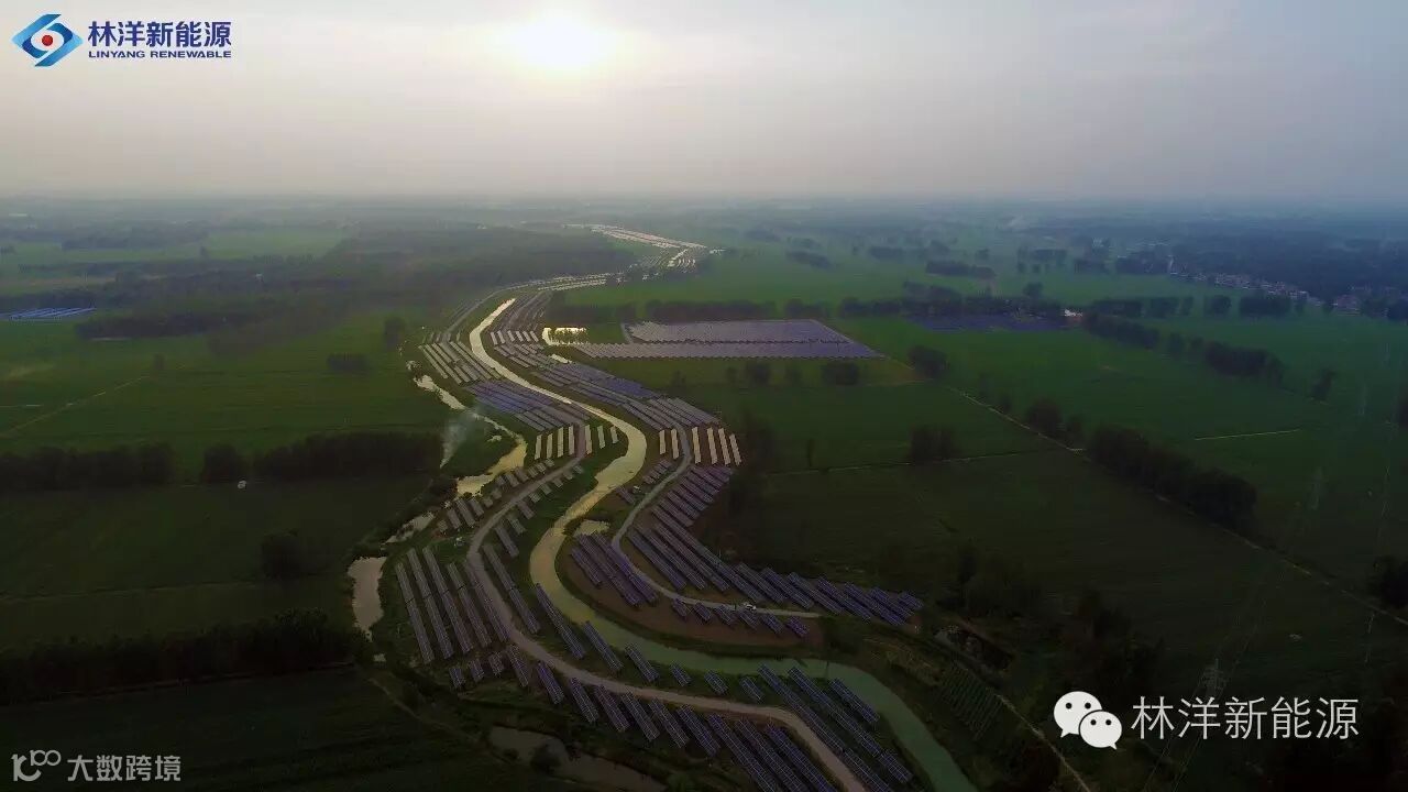 在蜿蜒曲折的小溪旁边,一座宏伟壮观的光伏电站屹立在旁,犹如一条小憩的巨龙,随时准备腾飞。这就是林洋新能源安徽阜阳五道沟20MW农光互补光伏电站。