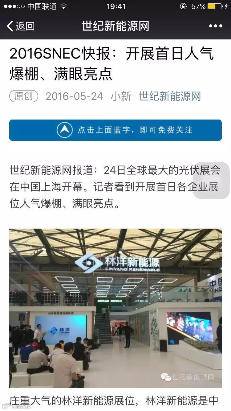 “庄重大气的林洋新能源展位”,点开世纪新能源网《2016SNEC快报:开展首日人气爆棚、满眼亮点》文章首先映入眼帘的就是林洋新能源的展台。