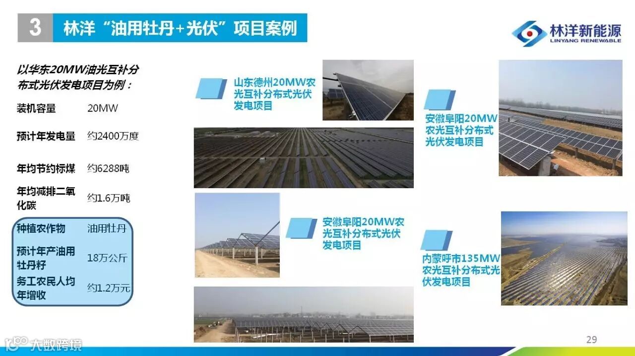 会上,林洋新能源总经理裴骏发表了主题为《林洋“光伏+农业”创新发展模式介绍》的演讲,为在座嘉宾带来了林洋多种分布式电站的成功案例并着重介绍了具有林洋特色的“光伏+农业+林业”创新商业模式:在传统的农光互补项目中注入集生态效益、社会效益及经济效益于一身的多年生灌木油用牡丹。演讲内容高度符合上述领导提出的几大创新理念。