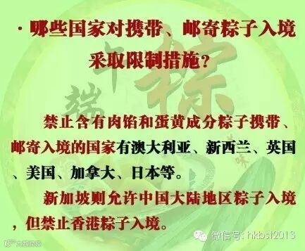 人民网北京5月20日电 据北京市公安局官方微博消息,端午节临近,一些市民在携带、邮寄粽子进出境时遇到了因检疫风险而遭拒的尴尬:有的国家和地区禁止大陆粽子入境,有的则禁止特定品种入境。同时,我国对于其他地区和国家的粽子入境也是有规定的。北京市公安局提醒网友,德国、法国、西班牙包括中国台湾等23个国家和地区禁止大陆粽子入境。