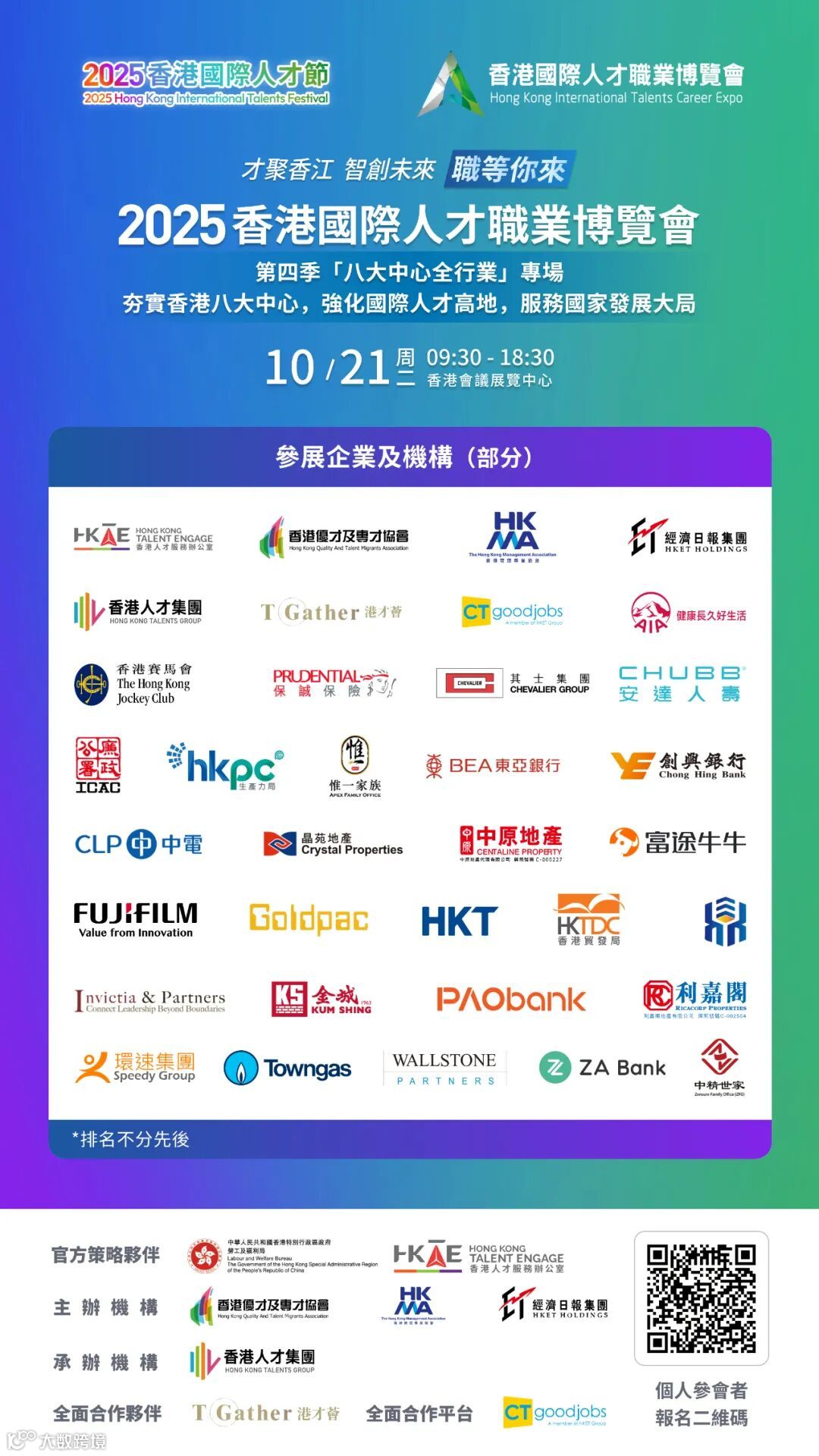 「2025 香港國際人才節」以“凝才聚智,協同發展,領航未來” 為主題,除了多個領域的人才專業論壇活動,現場還設置三大展區,包括2025香港國際人才節暨第五屆香港國際人才高峰論壇展區展示來自內地的政府、機構和企業;2025香港國際人才職業博覽會(第四季)展區,則聚焦 “八大中心全行業” ,匯聚香港眾多行業知名企業,為企業和人才提供直接交流的平台;TGather人才專業服務區為來港精英提供居住、教育、醫療、創業等全方位生活與事業發展支援 。本次活動廣邀中央政府有關領導、香港特區政府主要官員、內地相關政府和國際組織主要官員、政商學研各界知名人士、海內外高端人才齊聚一堂,積極搭建國際高端人才交流、對接、合作平臺,為香港、粵港澳大灣區等區域和國家的高質量發展提供人才和智力支持!