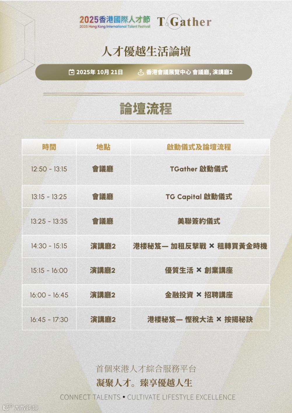 2025香港國際人才節還特設「TGather人才優越生活論壇」,著眼於人才在港長期發展與安居樂業,涵蓋居住、教育、醫療、金融、就業等全維度服務。活動將見證TGather「港才薈」與首批合作機構如香港電訊、美聯集團、東華三院譚鑑標李慧翹竹林居、美心集團、眾安銀行及薔薇資產管理等的啟動禮,並將舉辦香港居住指南講座、個人投資及香港商業機遇講座、優質教育醫療及創業講座等,內容緊貼人才實際需求,助力人才穩健紮根。